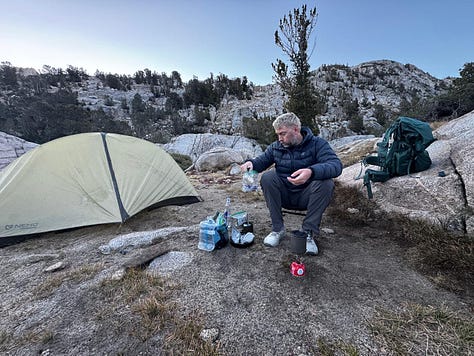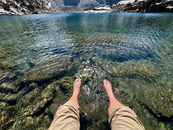 Boots off, whiskey in hand, I dipped my feet in the lake. The water stabbed like needles — maybe 38 degrees, maybe colder. Painful, but alive. Glenn felt the altitude hit him hard and retreated to the tent for a nap. At 11,000 feet, the mountain doesn’t ask if you’re ready. It just takes. While he slept, I filtered water and scribbled the first notes of this trip.