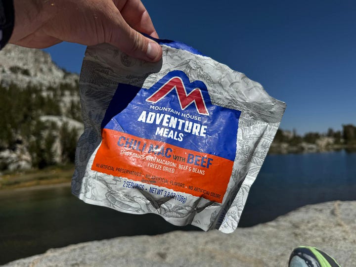 We passed Blue Lake (Top Right) — a teaser of what was coming — then stopped at Dingleberry Lake (yes, it’s really called that) for lunch: chili mac and cheese that tasted like victory. The scene was ours alone until a group of day hikers drifted in. We packed up and pushed on.